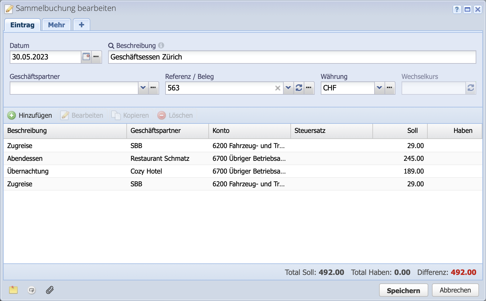 Im Journal über Hinzufügen Sammelbuchung hinzufügen den Dialog öffnen. Nebst einer Beschreibung kann im Geschäftspartner Feld ein allgemeiner Geschäftspartner für alle Buchungen eingegeben werden. Da die Spesenabrechnung unterschiedliche Belege enthält, wird das Feld hier nicht ausgefüllt.