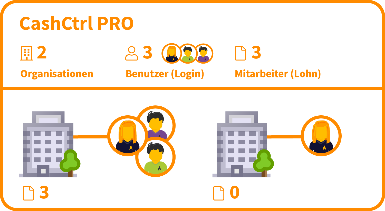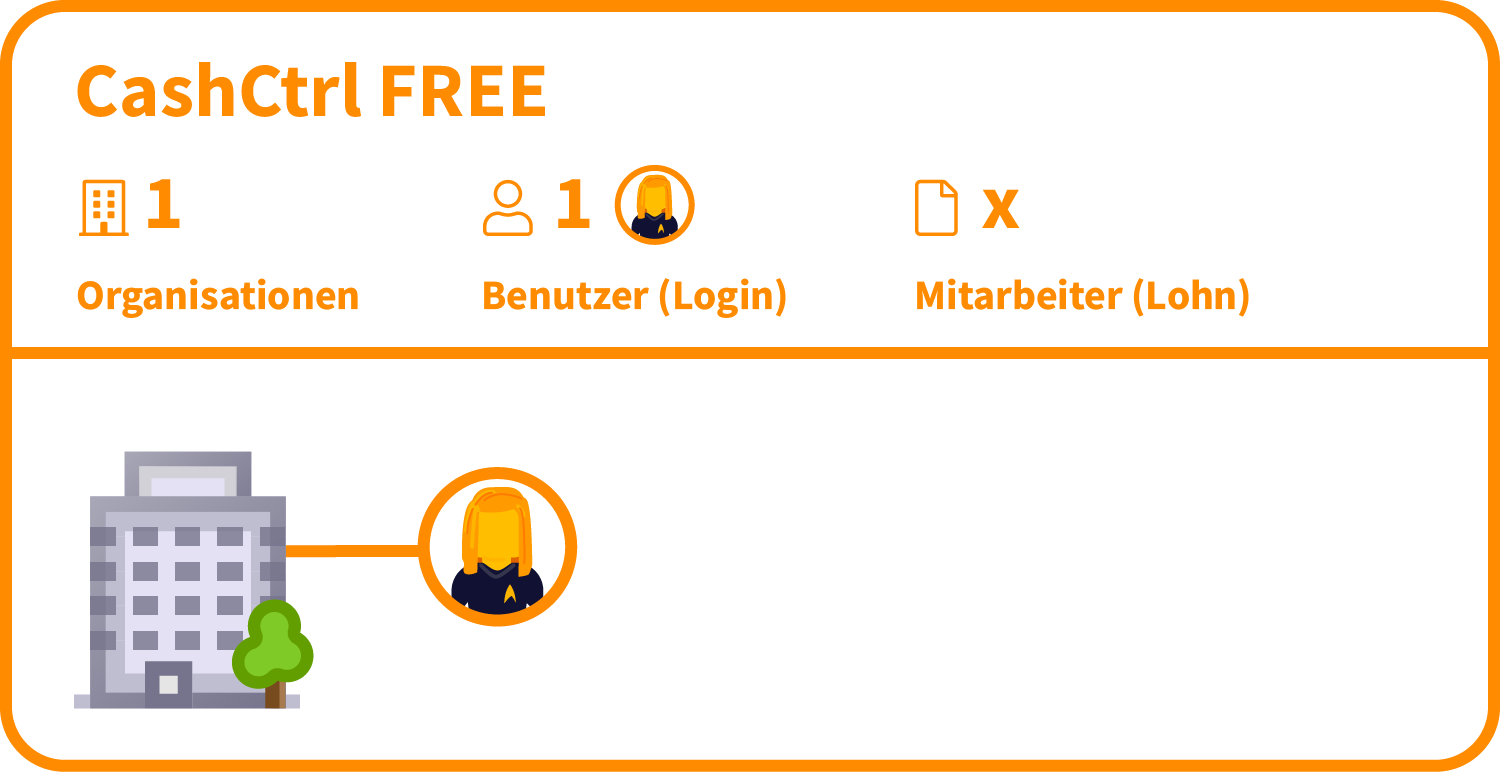 Der CashCtrl FREE Account besteht aus einem Benutzer und einer Organisation (Mandant) von welcher der Benutzer Eigentümer ist. Diese Konfiguration ist kostenlos und steht nach der Registrierung zur Verfügung. Ein FREE Account kann nicht um weitere Mandanten oder Benutzer erweitert werden.