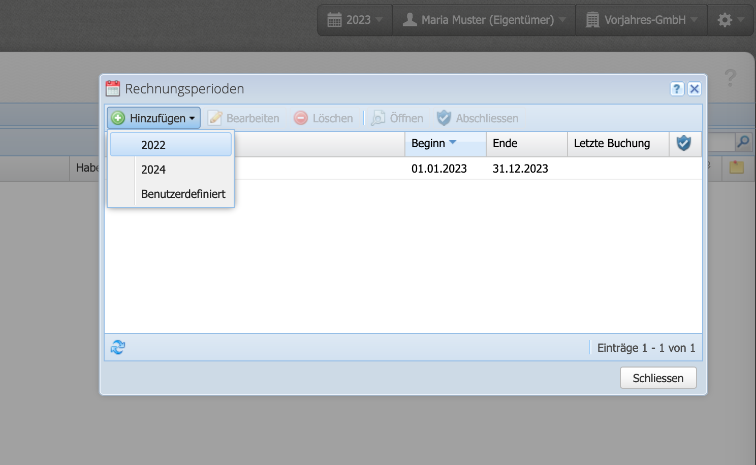 Oben im Programm auf das Dropdown beim Kalendersymbol klicken und über Verwalten Hinzufügen die Vorjahresperiode erstellen.