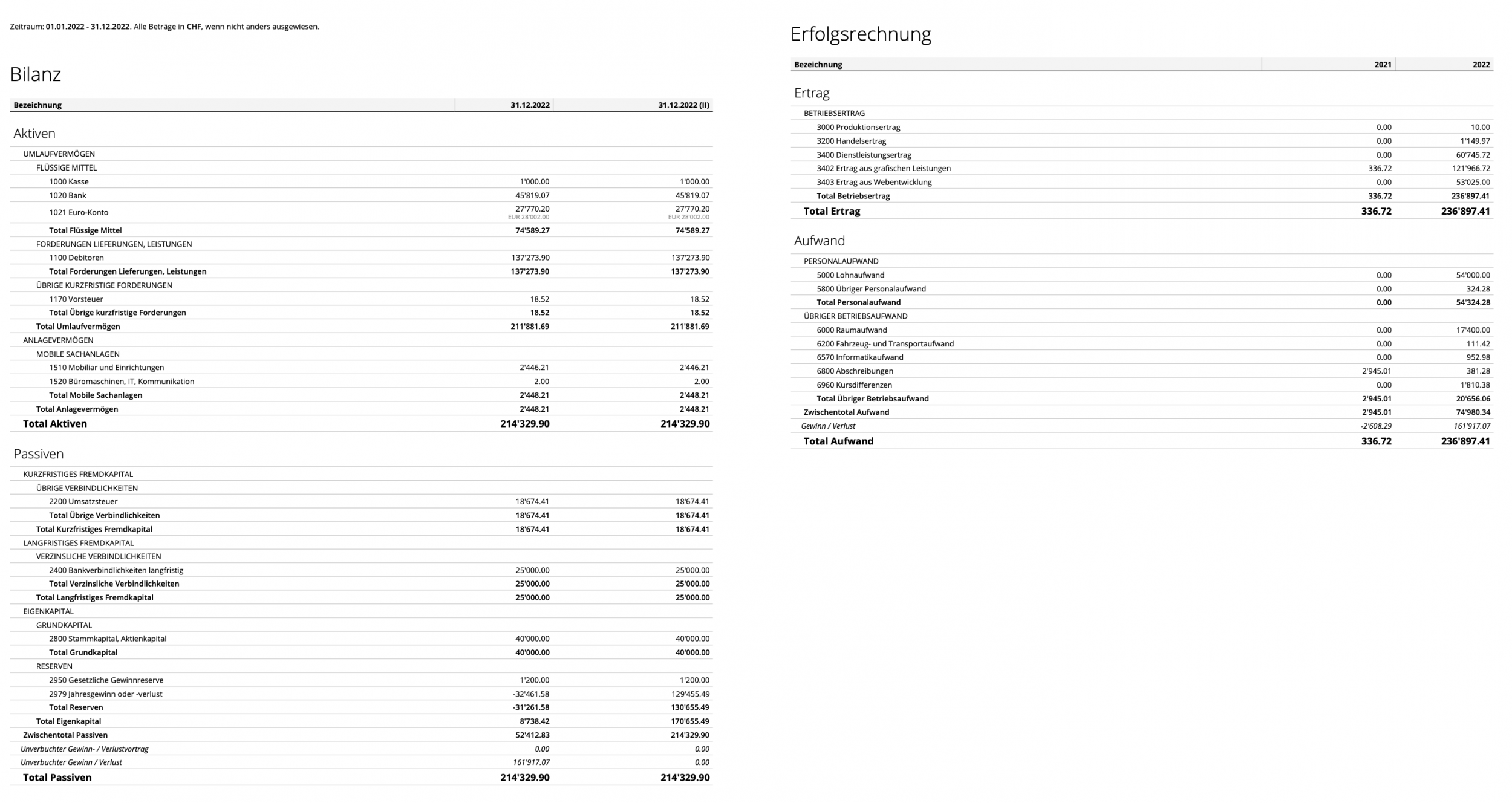 In der bisherigen Buchhaltung die Bilanz und Erfolgsrechnung des vorherigen Jahres erstellen, um die Zahlen für die Übertragung parat zu haben. Unser Screenshot rechts zeigt die Bilanz/ Erfolgsrechnung der Maria Muster GmbH aus CashCtrl, die wir im nächsten Schritt in eine neue Organisation einpflegen.