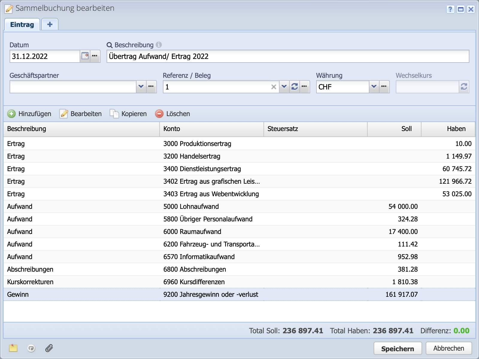 Damit auch die Erfolgsrechnung übertragen wird, muss noch eine Sammelbuchung erstellt werden, in der die Aufwände und Erträge sowie der Gewinn/ Verlust verbucht werden.