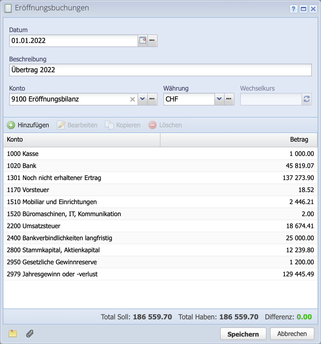 Wichtig: Werden Fremdwährungen verwendet, muss je Fremdwährung eine eigene Eröffnungsbuchung gemacht werden. Daher wird hier das Euro Konto aussenvorgelassen und die Summe Soll / Haben ist daher um den Saldo des Euro-Kontos geringer. Damit Soll / Haben ausgeglichen ist, wurde das Stammkapital um den gleichen Betrag reduziert und beträgt hier statt 40T nur 12'239.80.-