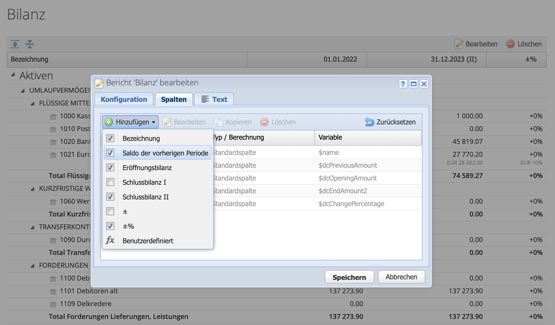 Nun da die Überträge erledigt sind, kann für das aktuelle Jahr gebucht werden und beim Jahresbericht in der Bilanz und der Erfolgsrechnung die Spalte des Vorjahres eingeblendet werden. Dies funktioniert beim Bericht über Klick auf Bearbeiten Spalten Reiter Hinzufügen Saldo der vorherigen Periode.