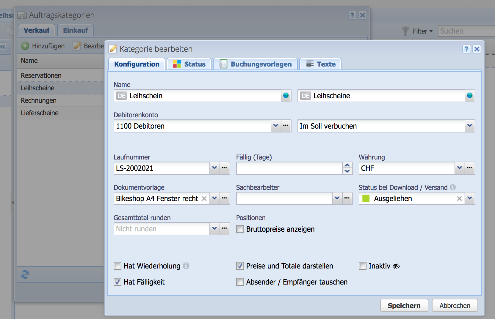 Über Einstellungen Auftragskategorien kann die neue Kategorie Leihschein erstellt werden.