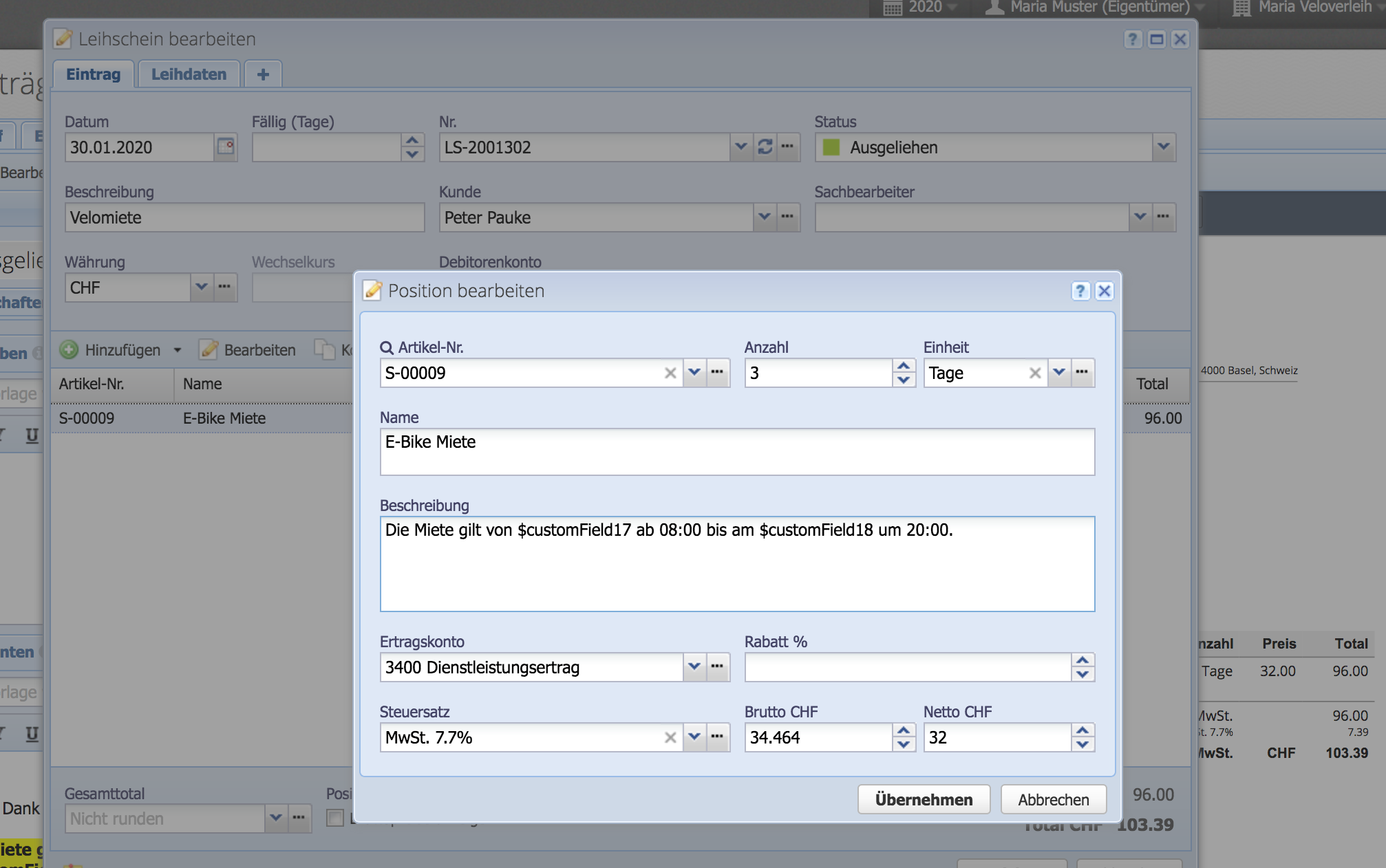 Vorlage erstellt, nun im Aufträge Modul über Hinzufügen Leihschein ein neues Dokument erstellen. Eine Position Velomiete hinzufügen und zum Leihdaten Reiter wechseln. Dort kann nun bequem das Start- und Enddatum eingetragen werden.