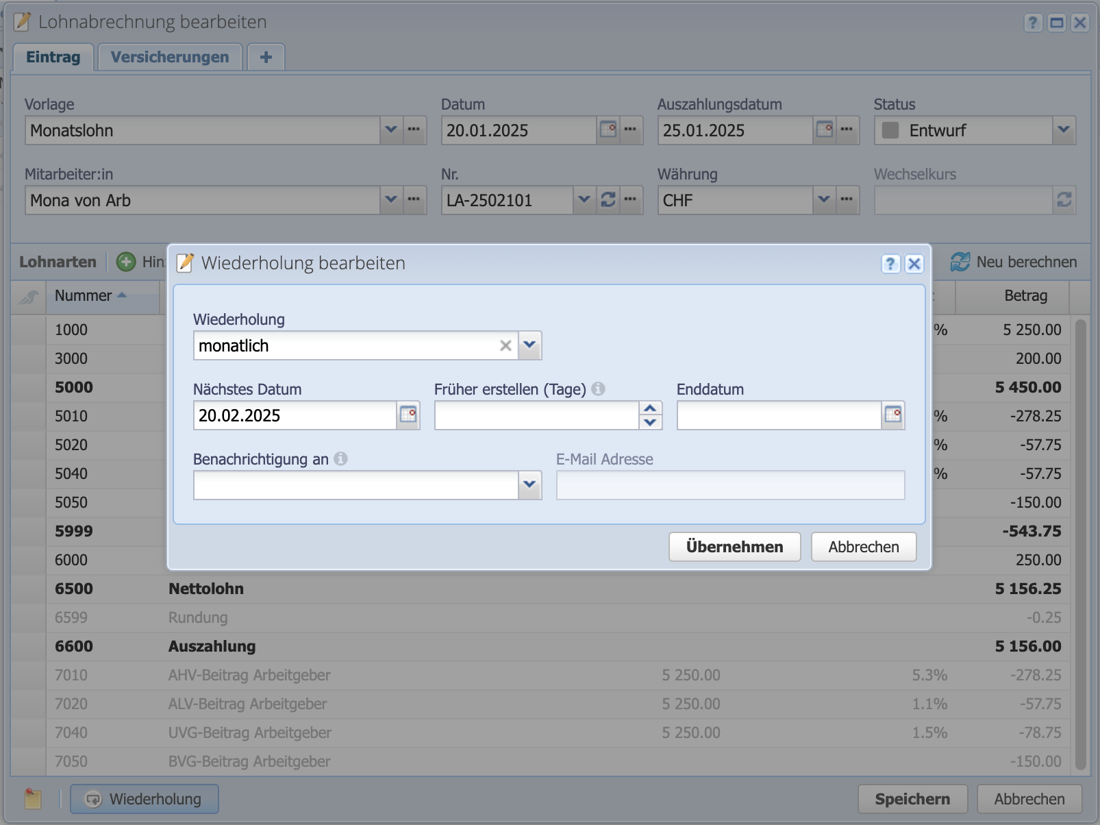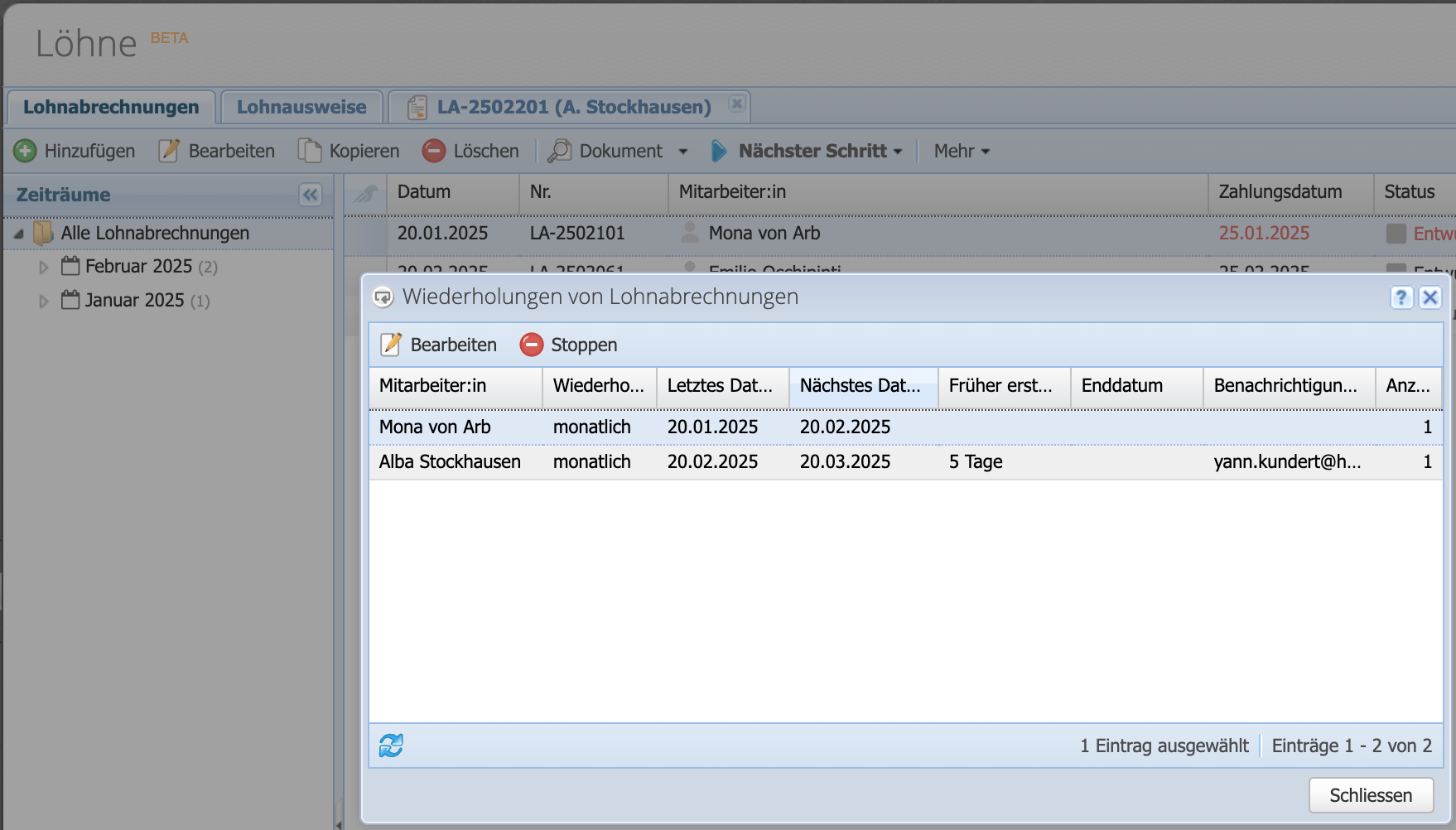 Die Lohnabrechnung öffnen und über "Wiederholung" unten links den Bearbeitungsdialog aufrufen. Dann die gewünschte Wiederholung wählen, das nächste Ausführungsdatum wird analog dem gewählten auf dem Dokument automatisch gesetzt.