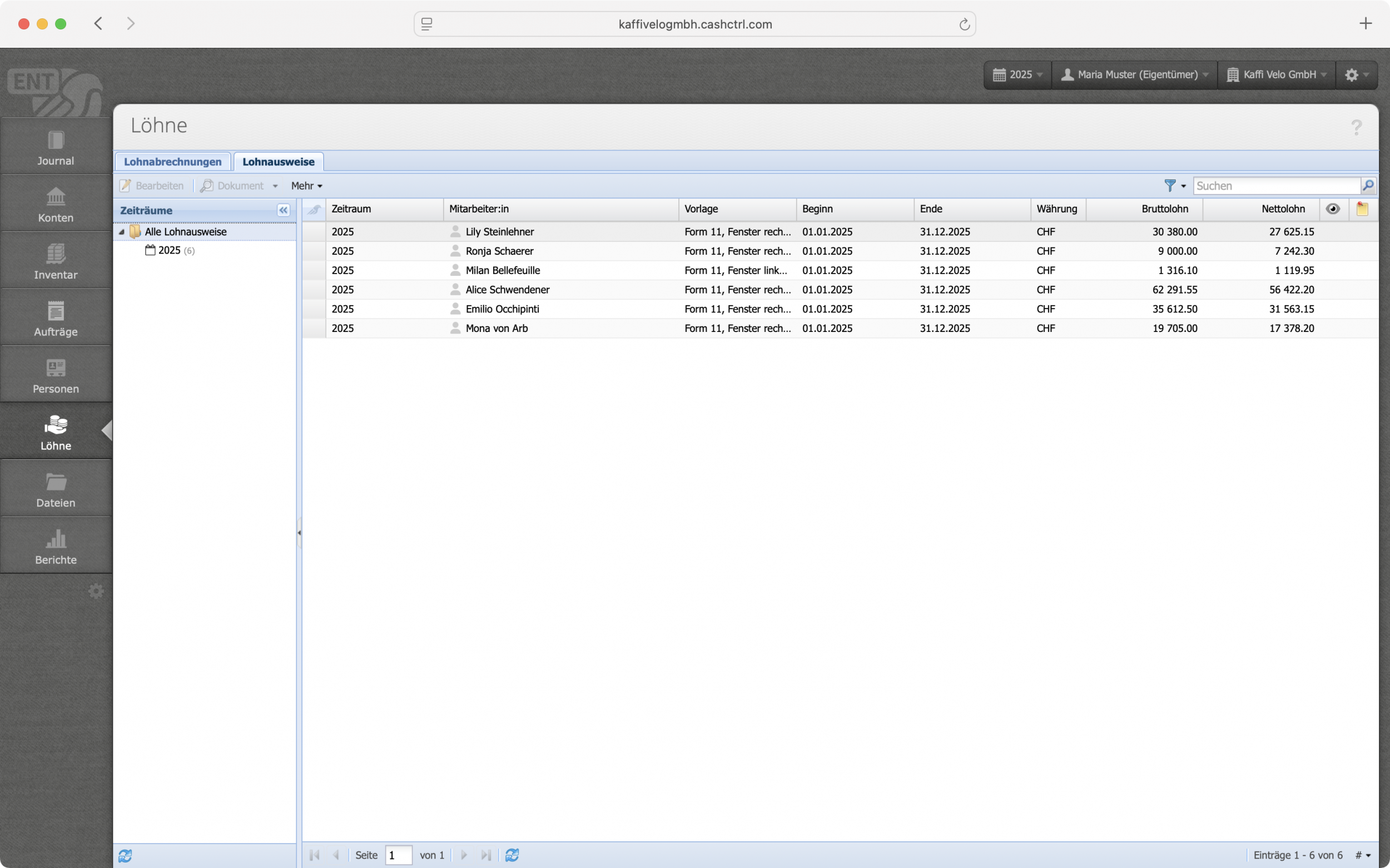 Die Übersicht der Lohnausweise findet sich im Bereich Löhne im zweiten Reiter neben den Lohnabrechnungen Lohnausweise.