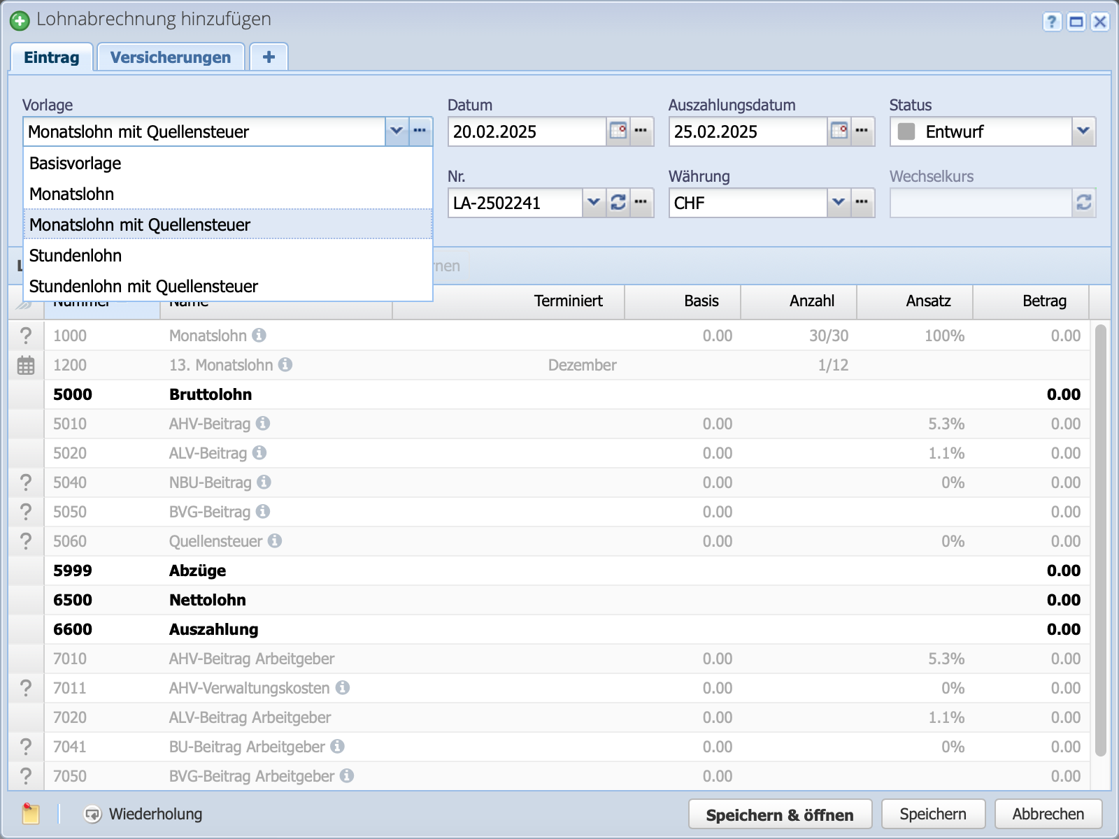 Im Bereich Löhne über Hinzufügen eine neue Lohnabrechnung öffnen. Zunächst eine Lohnvorlage wählen mit Quellensteuer. Es gibt zwei vorkonfigurierte Lohnvorlagen: