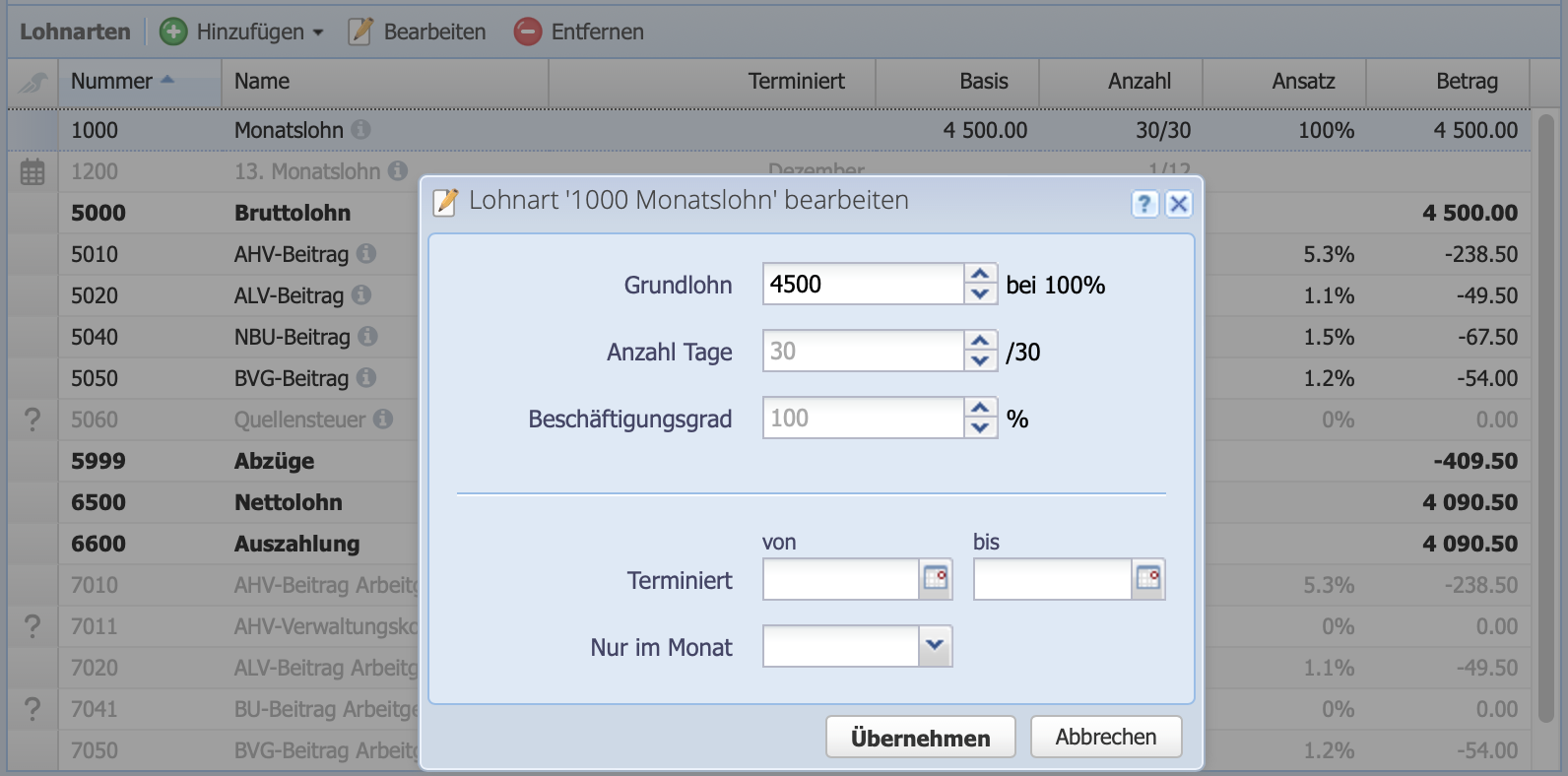 Im Weiteren können die Abzüge und Zulagen ergänzt werden. Mehr dazu im Stundenlohn Tutorial oder Monatslohn Tutorial
