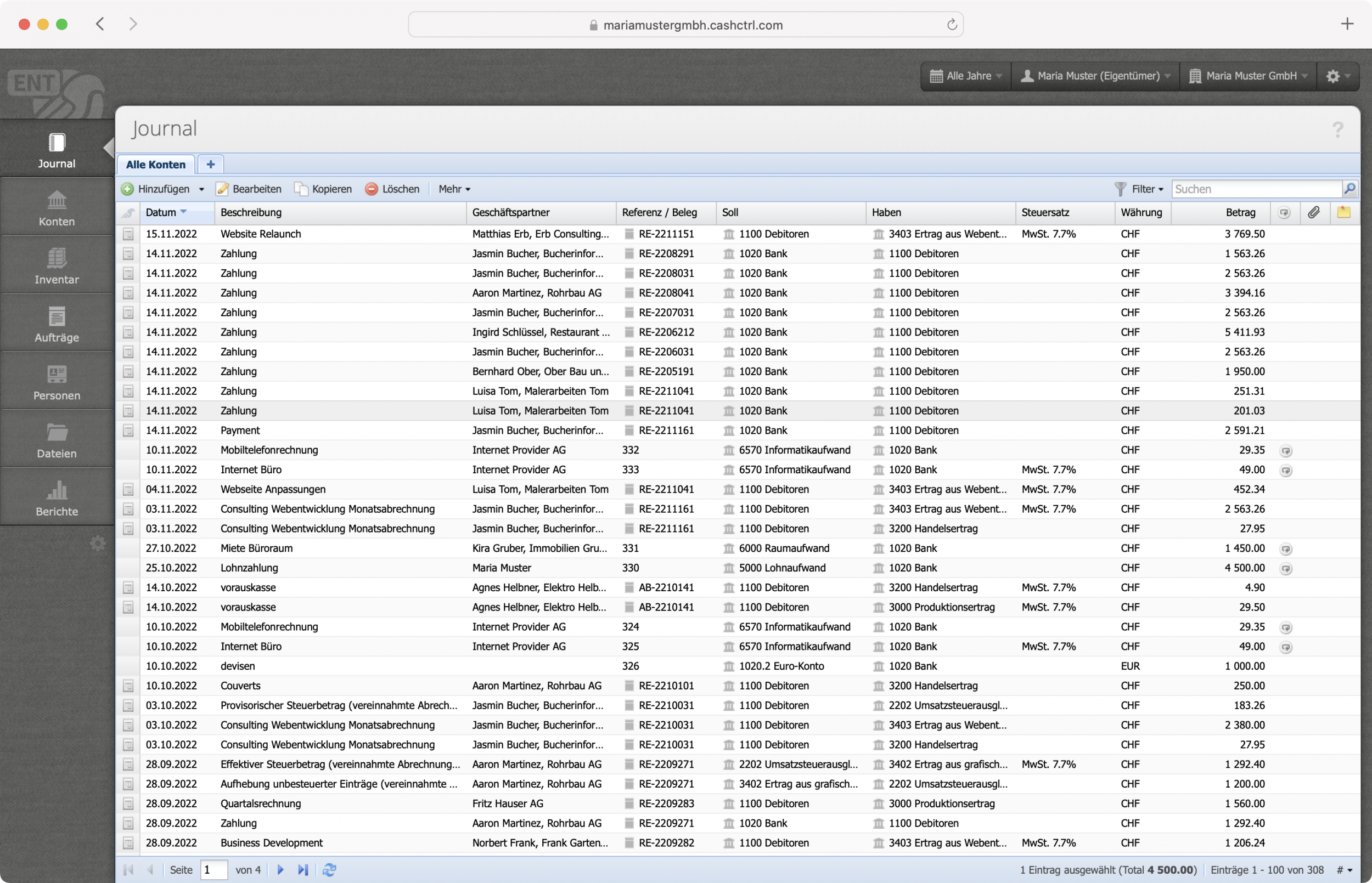 Übers Jahr die Buchhaltung führen, Rechnungen stellen und Einkäufe tätigen. Dabei mit CashCtrl laufend die Buchhaltung auf dem aktuellen Stand halten. Die Rechnungsperiode ist variabel und kann angepasst werden. Ist der Kontenrahmen eingerichtet können Geschäftsfälle selbstständig verbucht werden — auch ohne Treuhänder:in oder weitreichendere Erfahrung in der Finanzbuchhaltung.
