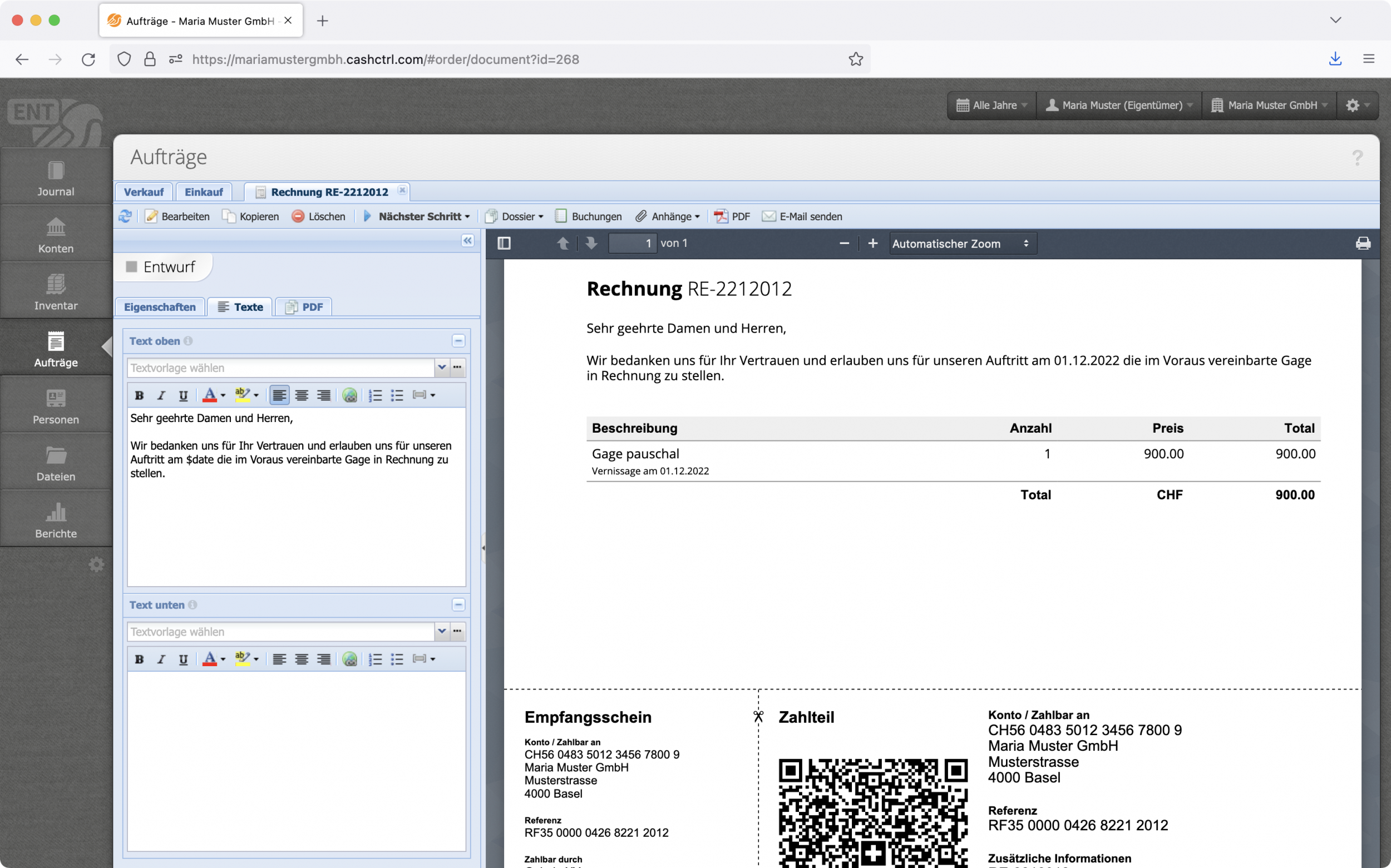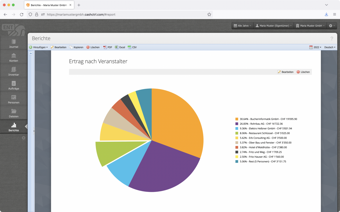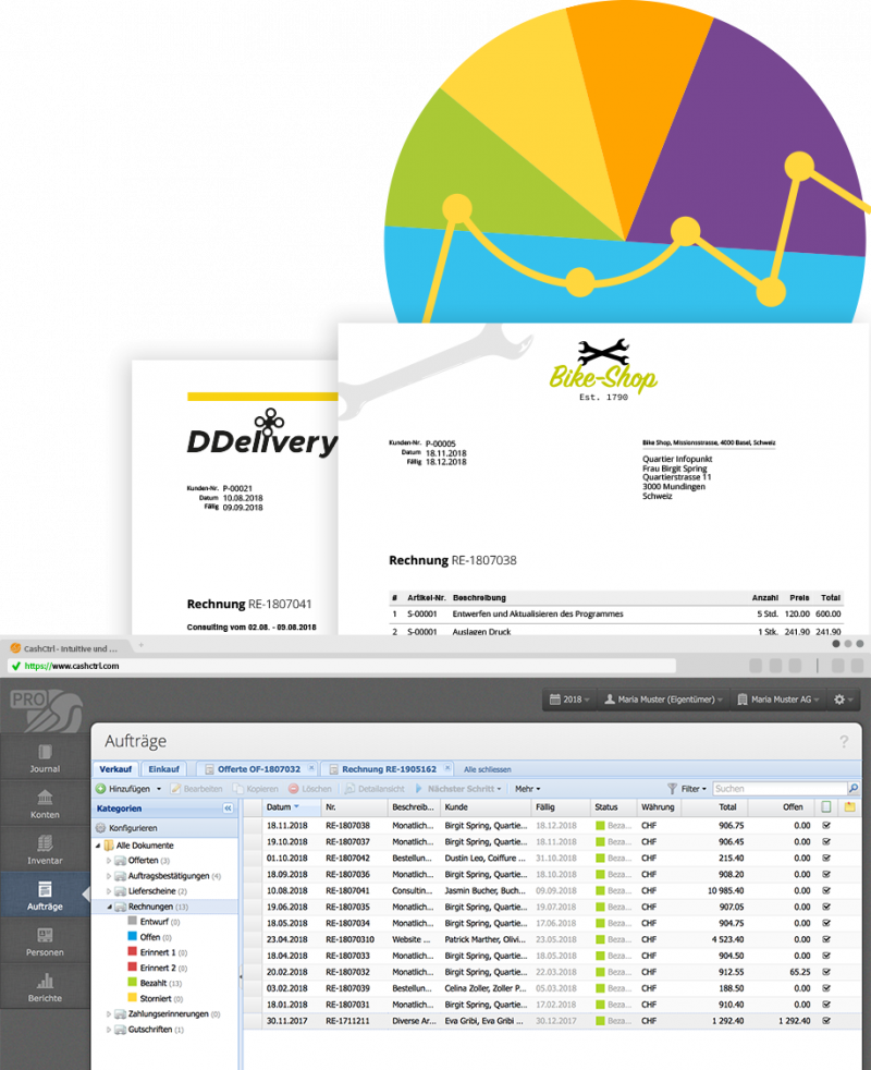 Ein in CashCtrl erstelltes Dokument erledigt gleich mehrere Dinge automatisch im Hintergrund: Das Dokument steht als PDF Download zur Verfügung, die Beträge werden verbucht und die Auswertungen aktualisiert. Zeitersparnis inklusive.