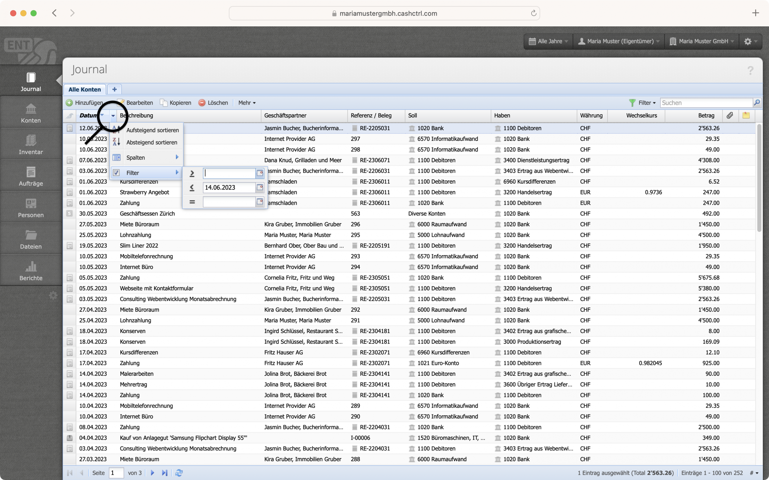 CashCtrl offers a variety of filtering and sorting options. For example, you can filter by account or by time period. Basically, you can sort and filter by all columns. If a filter is active, the name of the column is displayed in bold italics.