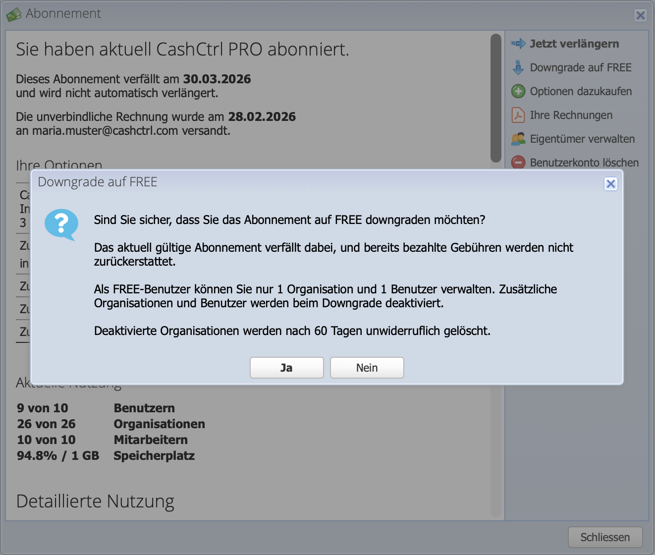 The overview shows the current subscription period, the current usage of users and organizations and storage space.