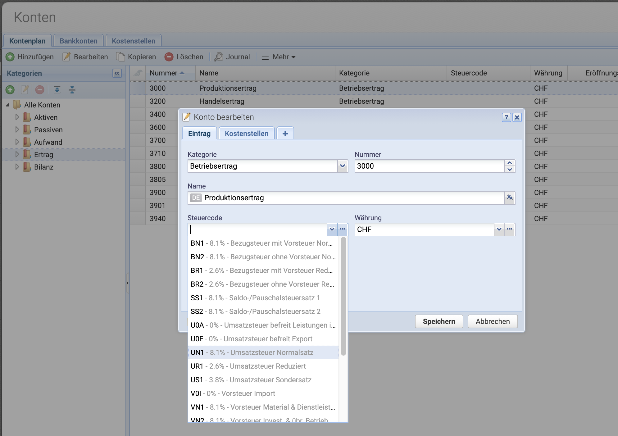To avoid having to enter tax codes manually every time, you can set them for revenue or expense accounts. To do this, select the desired account via Accounts and click Edit.