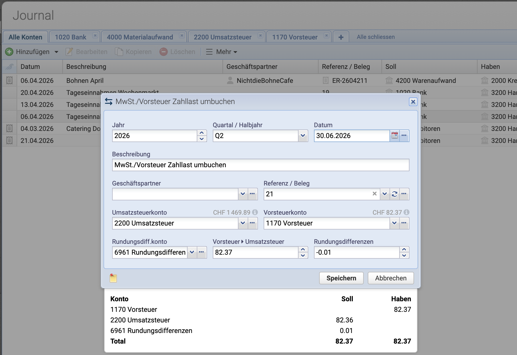 In the dialog box, select the quarter; the fields for the sales tax account, input tax account, and the account for any rounding differences are pre-filled. The calculated input tax amount is automatically entered; now complete the booking by clicking Save.