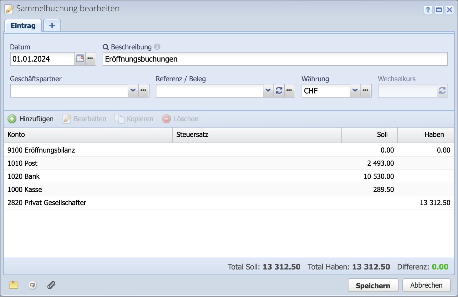 The opening entries are a predefined collective entry to 9100 Opening Balance. At the bottom, the total debit and the total credit and their difference are shown. Only when debit and credit are balanced, i.e. the difference is 0.00, it is possible to save.