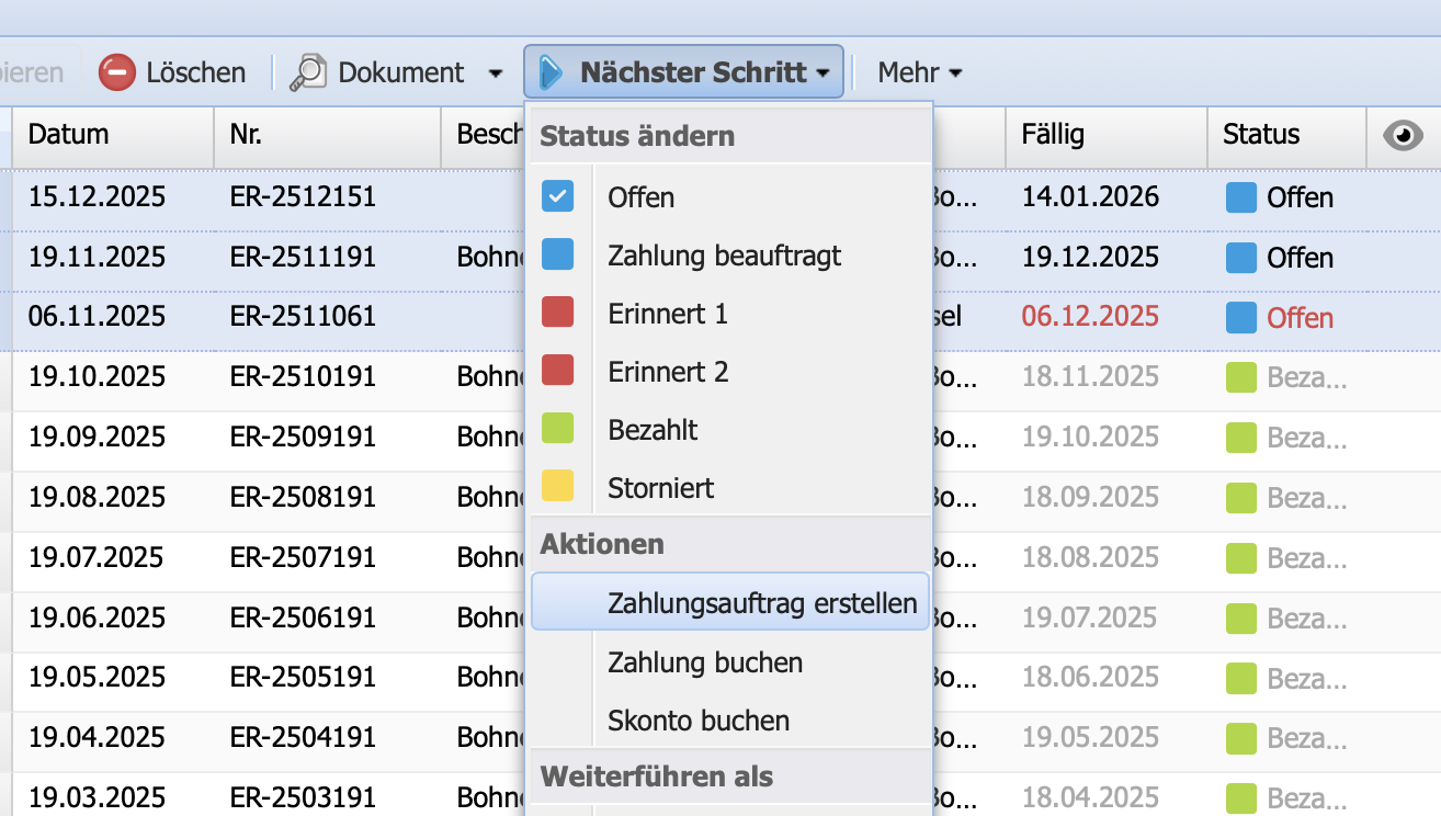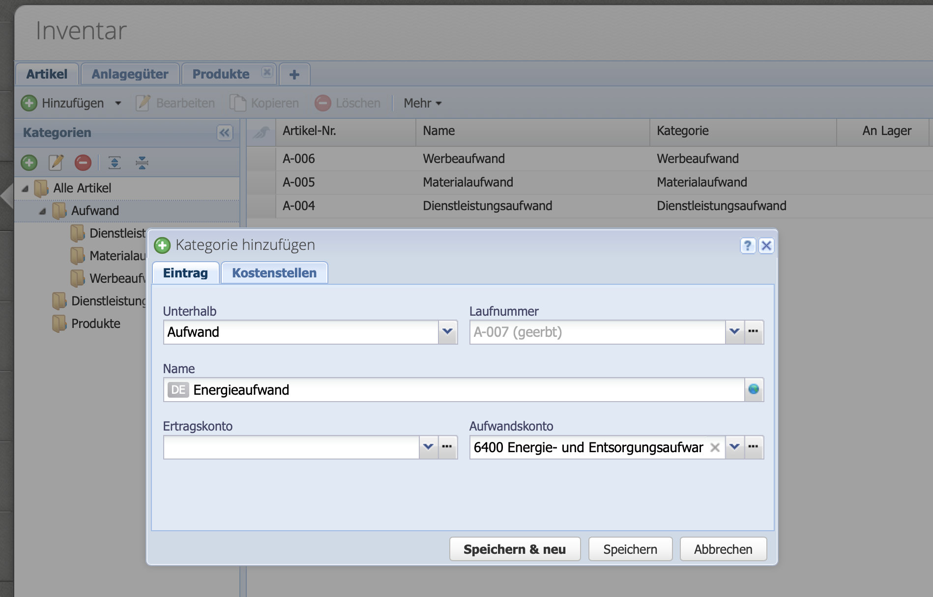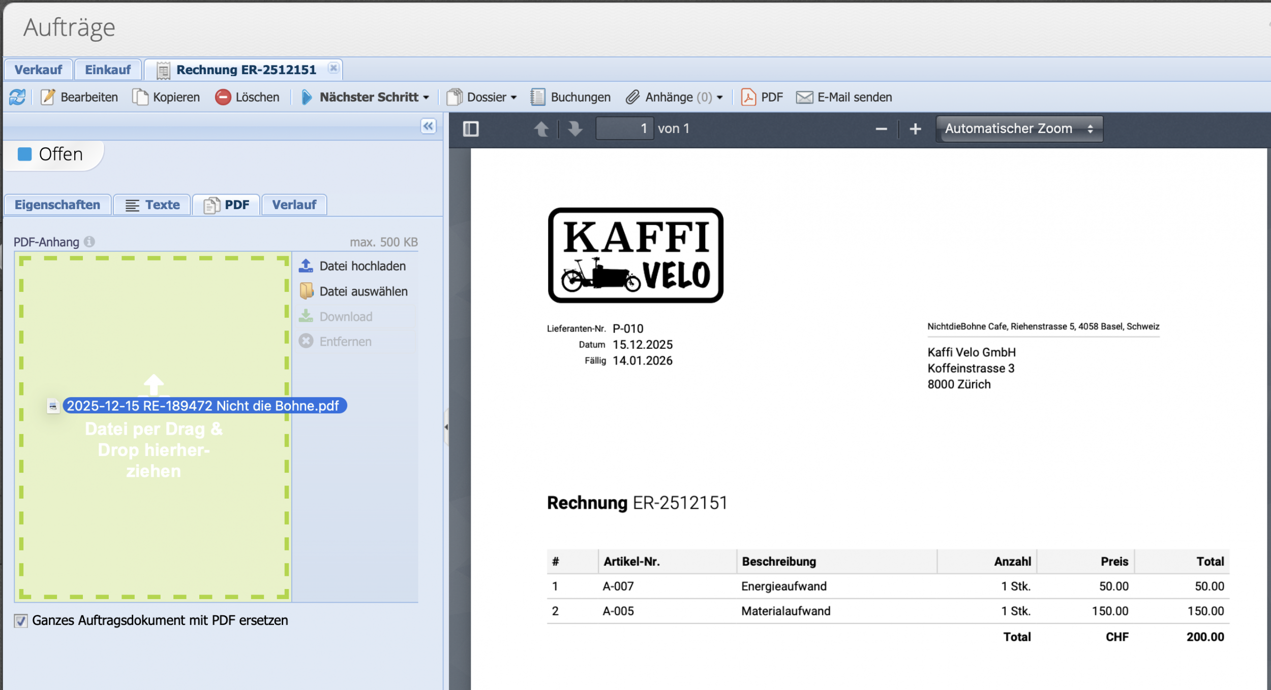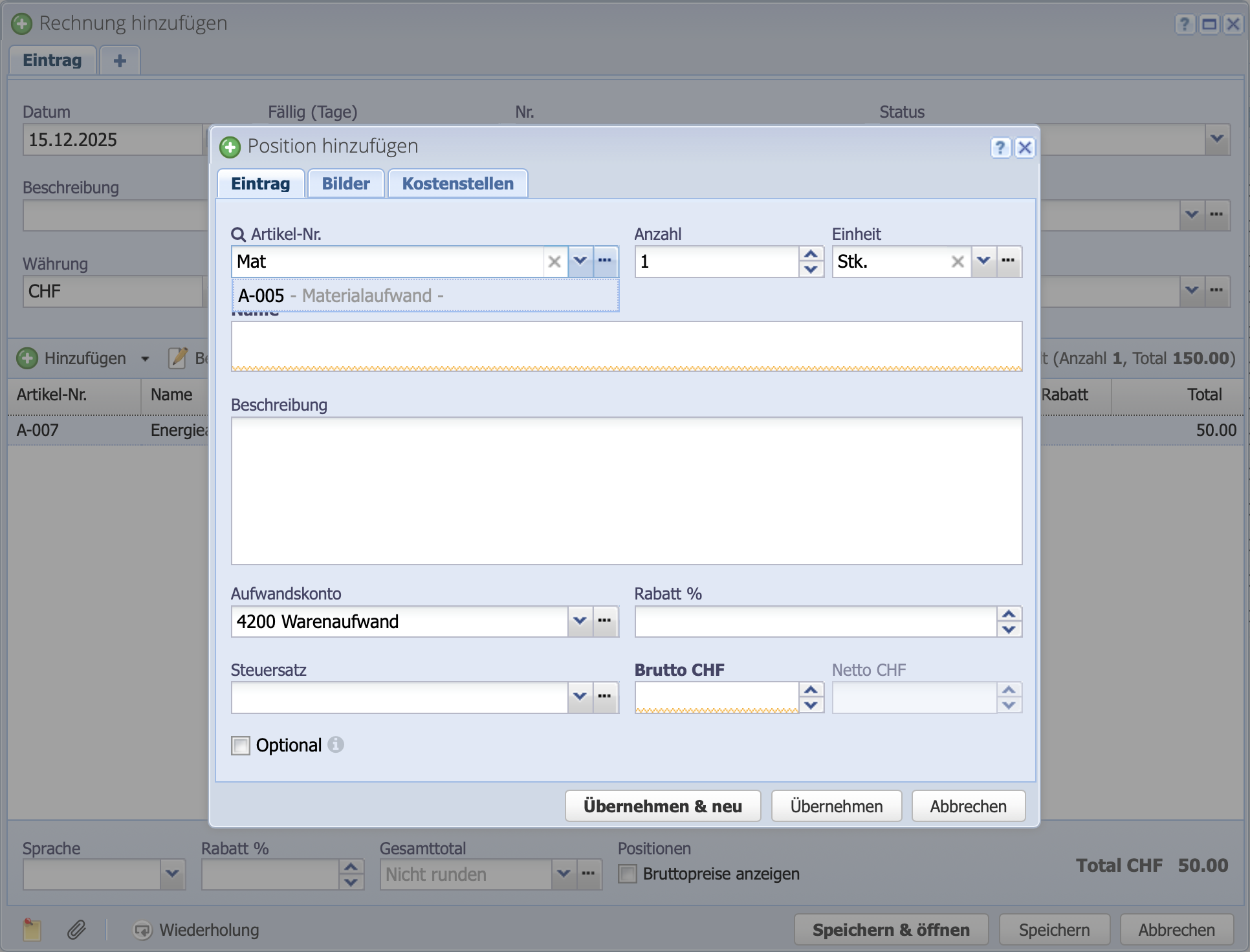 The cursor is directly in the search field for the item number. Now enter the first few letters, e.g., for material costs, enter “Mat...” and select the item. Use the tab key or click with the mouse to jump to the Gross CHF field and enter the amount. Add further items or transfer an item.