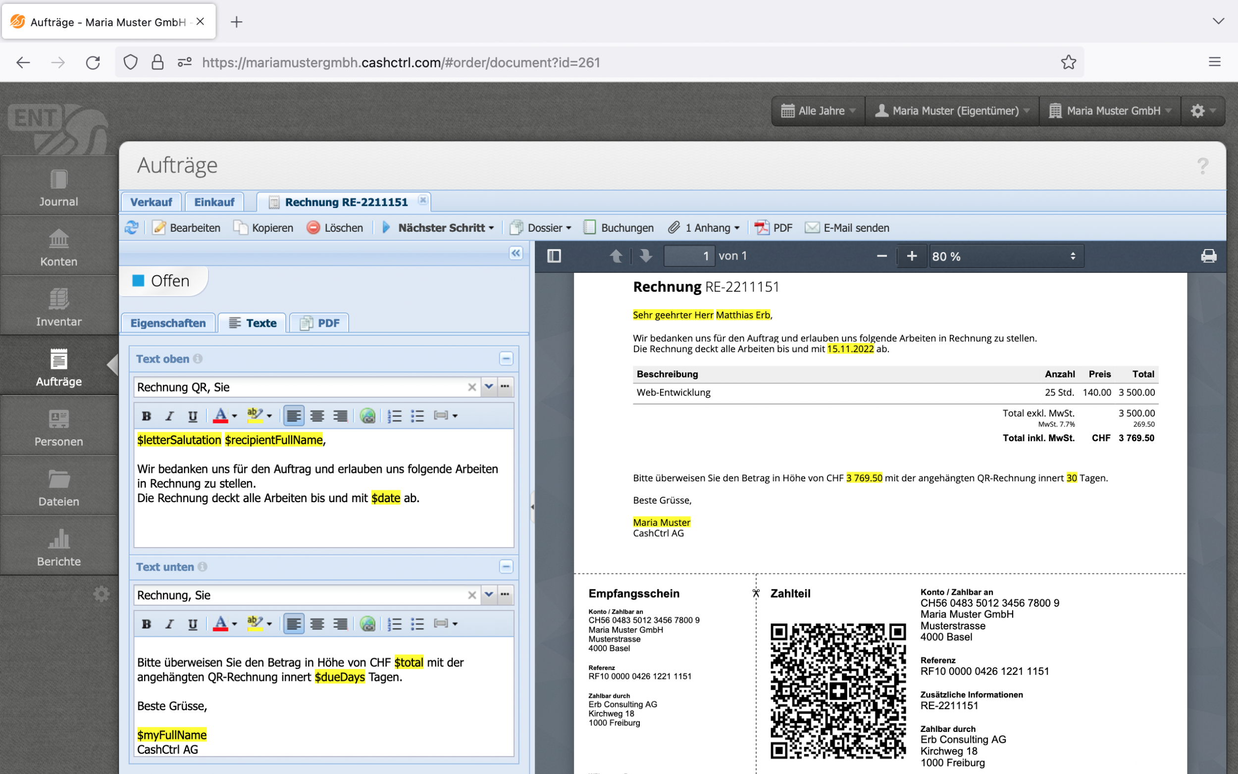 Articles or services are stored in the inventory and simply added to the document as a position. For the appearance of the PDF, select from the preconfigured layouts, for example print version or digital version — with or without QR payment slip.