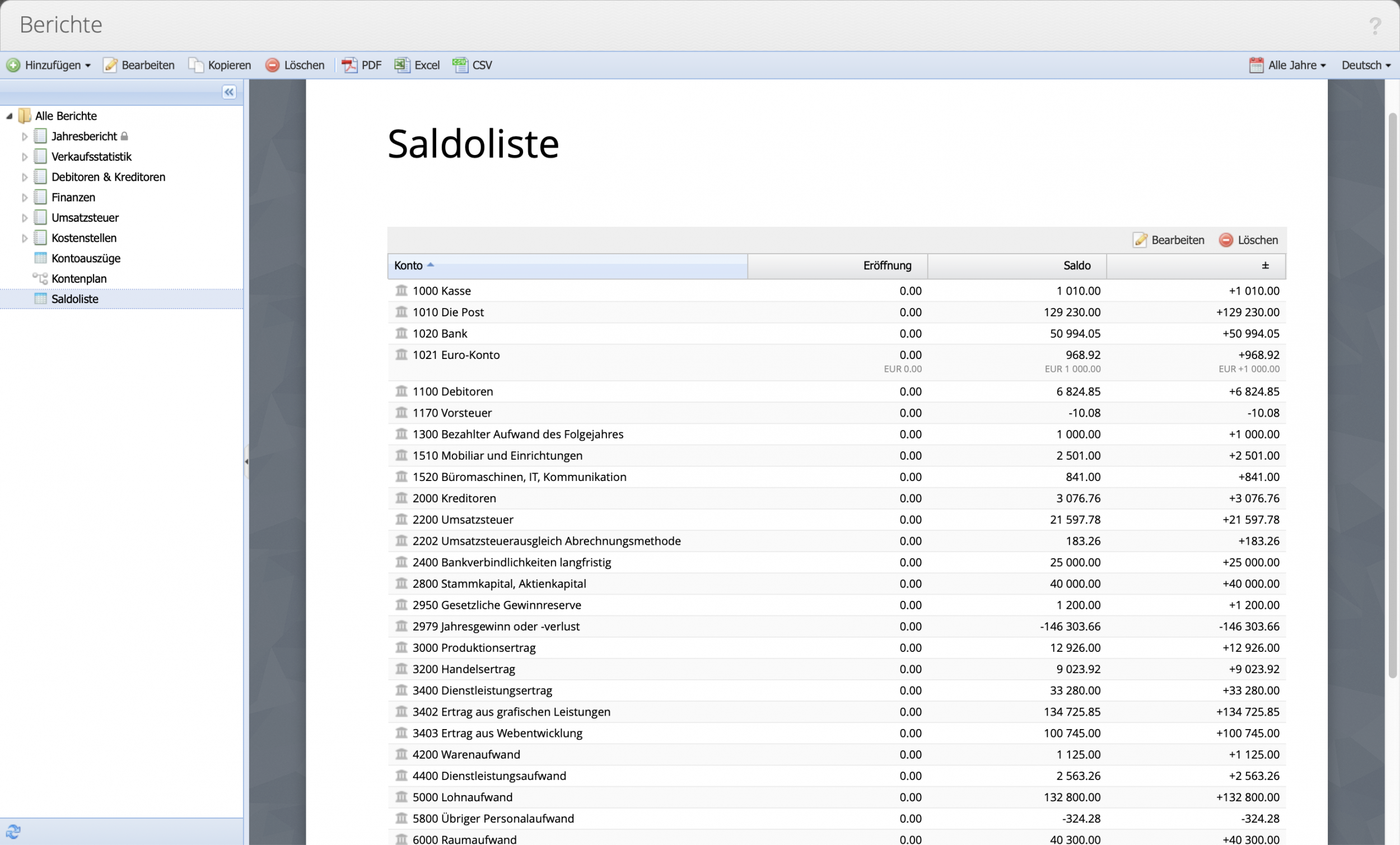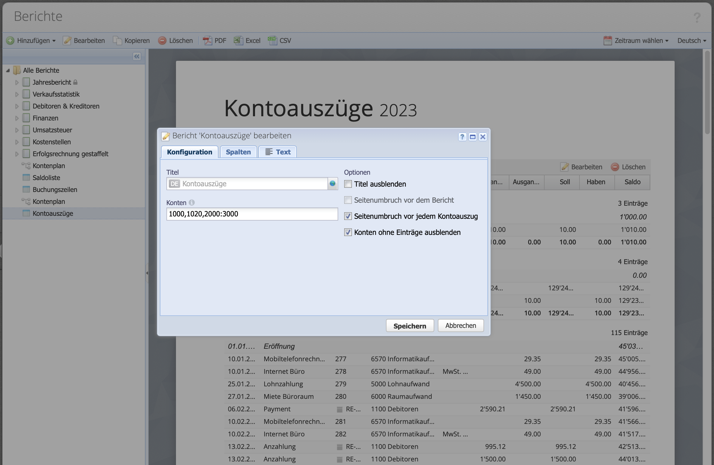 For flexible reporting, CashCtrl relies on report sets that can be compiled by the user. This creates individual reports that can be shared with third parties, such as the annual report for the tax authority or for shareholders. Report elements can be added to a set and dragged and dropped into the right order.
